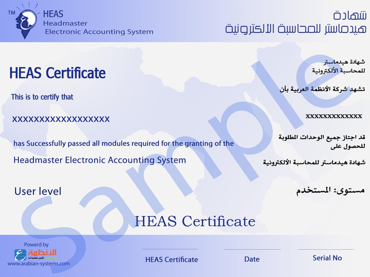 يمكن الحصول على شهادة هيدماستر للمحاسبة الالكترونية من خلال الدورات التدريبية التي تعقد في المعاهد المعتمدة لدى شركة الانظمة العربية للبرمجيات .